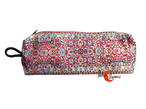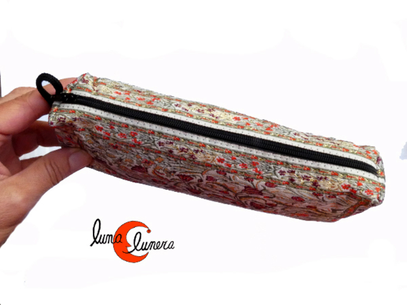 Estuche de tela turca con cremallera. Caben varios bolígrafos y/u objetos de escritura: gomas, tipex, barra de pegamento pequeña, etc. También apto para llevar cosméticos o cualquier otra cosa similar. La tela tiene un aspecto dorado brillante, pripio de este tipo de materiale, típico de Turquía.
