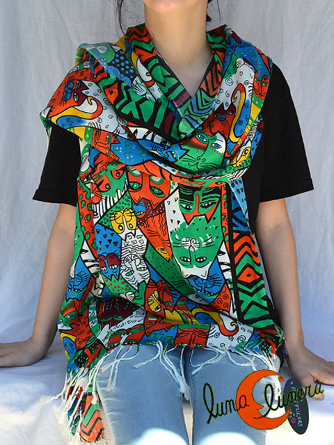 Precioso fular multicolor con dibujos de muchos gatos. Tela muy suave, 50 porciento algodón, 50 porciento viscosa. Media estación. Tela con caída. Terminación con flecos.