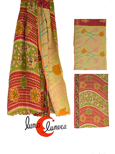 Preciosos, originales y auténticos fulares hechos en India por talleres artesanales y recuperando telas 100% de algodón de antiguos saris usados. (El sari es el vestido tradicional de las mujeres del subcontinente Indio). Se juntan dos telas y luego se cosen a mano con una puntada de running, llamada puntada kantha.