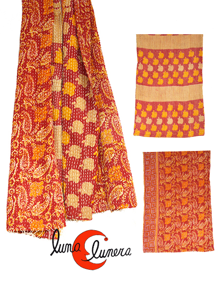Preciosos, originales y auténticos fulares hechos en India por talleres artesanales y recuperando telas 100% de algodón de antiguos saris usados. (El sari es el vestido tradicional de las mujeres del subcontinente Indio). Se juntan dos telas y luego se cosen a mano con una puntada de running, llamada puntada kantha.