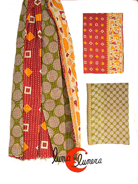 Preciosos, originales y auténticos fulares hechos en India por talleres artesanales y recuperando telas 100% de algodón de antiguos saris usados. (El sari es el vestido tradicional de las mujeres del subcontinente Indio). Se juntan dos telas y luego se cosen a mano con una puntada de running, llamada puntada kantha.