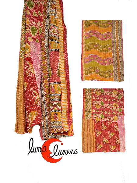 Preciosos, originales y auténticos fulares hechos en India por talleres artesanales y recuperando telas 100% de algodón de antiguos saris usados. (El sari es el vestido tradicional de las mujeres del subcontinente Indio). Se juntan dos telas y luego se cosen a mano con una puntada de running, llamada puntada kantha.