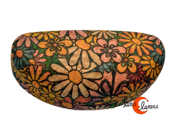 Colección Corcho. Funda para gafas rígida redonda grande, margaritas.
