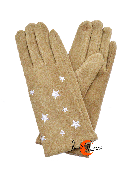 Guantes de tela color liso con estrellas bordadas blancas, color beige oscuro.