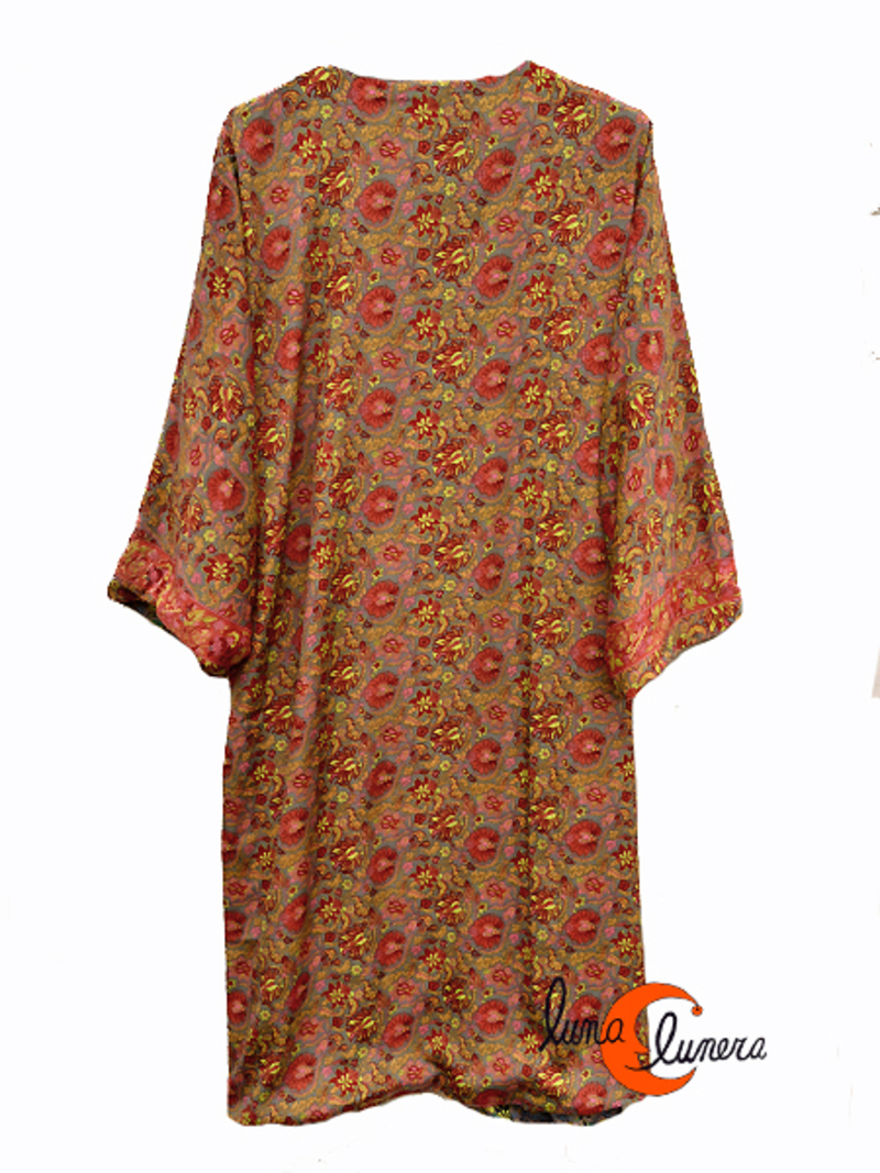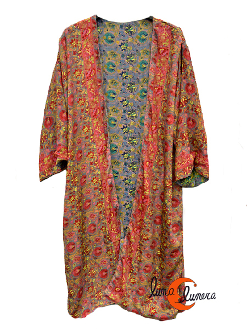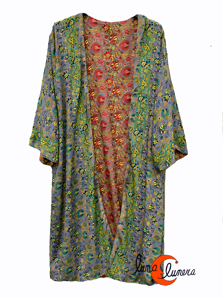 Preciosos Kimonos tipo chaquetas abiertas de seda de India. Son reversibles por lo que puedes escoger dos colores en una sola prenda. Que sean dobles también le da peso y bonita caída a la tela. Composición 70% seda y 30% viscosa.