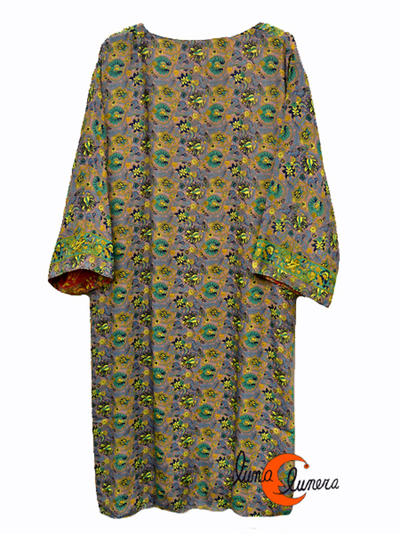 Kimono de seda reversible. Kimono 6 flores verdes sobre lila, interior rojo y gris.