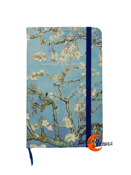 Preciosa libreta de papel para escribir. De tamaño pequeño, es ideal para llevar en un bolsillo y tenerla siempre a mano para poder utilizarla en cualquier momento. Tiene 90 páginas con líneas impresas; cinta marcapáginas y una goma para cerrarla. De tapas rígidas en las cuales tiene impresos famosos cuadros de Van Gogh. Son un regalo perfecto, un detalle bonito, útil y original.