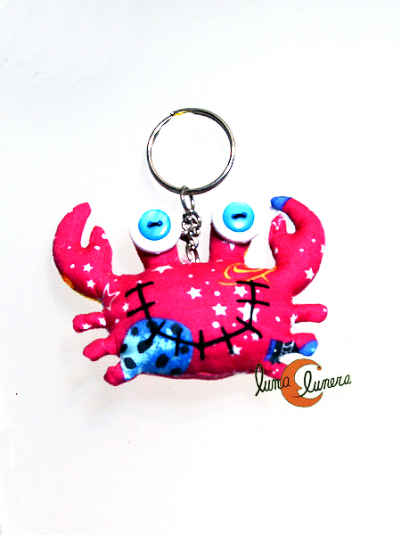 Lindo llavero con un cangrejo de pinzas colgando. El cangrejo está hecho con tela y relleno de algodón, artesanía totalmente hecha a mano. Llaman la atención sus ojos hechos con botones. El aro para las llaves cuelga de una cadenita, también puede usarse para colgar y adornar los bolsos.