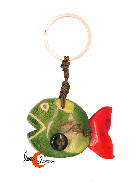Llavero con forma de pez hecho con semillas de tagua. La tagua tiene una forma redondeda, por lo que el pez tiene volumen, es decir, es redondito. Son llaveros muy vistosos, originales y divertidos, las semillas mantienen siempre el color y el brillo.
