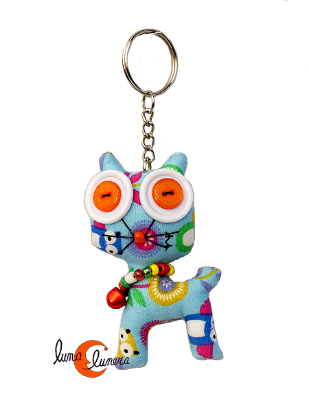 Lindo llavero con un gato. El gato está hecho con tela y relleno de algodón, artesanía totalmente hecha a mano. El aro para las llaves cuelga de una cadenita, también puede usarse para colgar y adornar los bolsos.