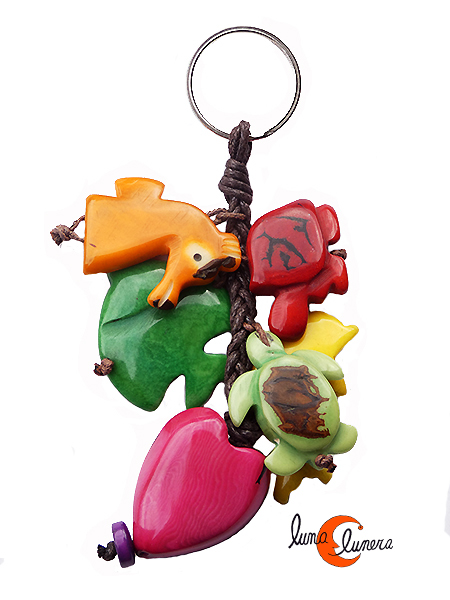Llavero con un racimo de figuritas de tagua: tortugas, caballito de mar, delfín, peces... hechos con semillas de tagua. Son llaveros muy vistosos, originales y divertidos, las semillas mantienen siempre el color y el brillo.
