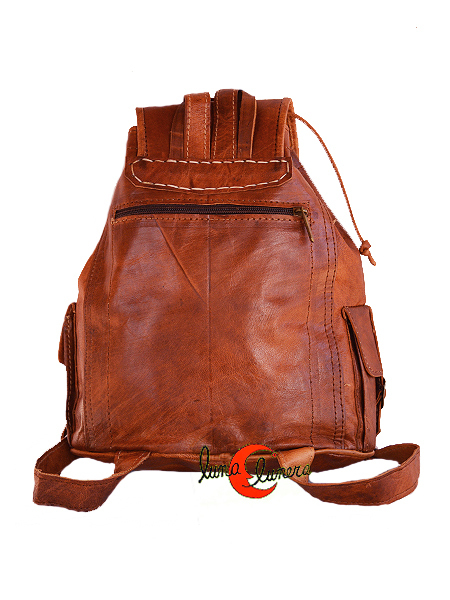Mochila de cuero marroquí de tamaño pequeño de piel engrasada. Tiene tres bolsillos por el frente más uno exterior antirrobo por la espalda con cremallera.  Forrada por dentro. Asas regulables.