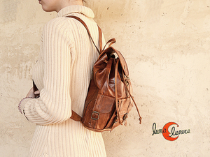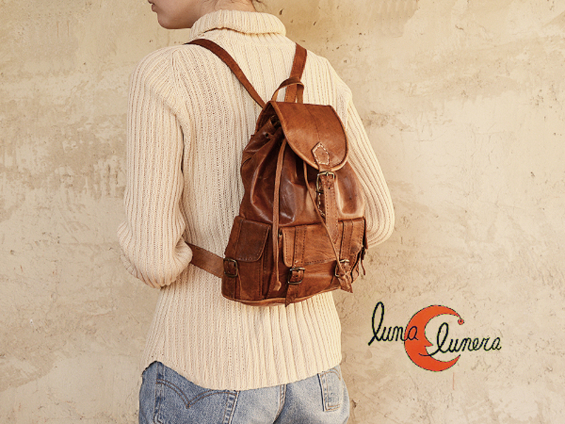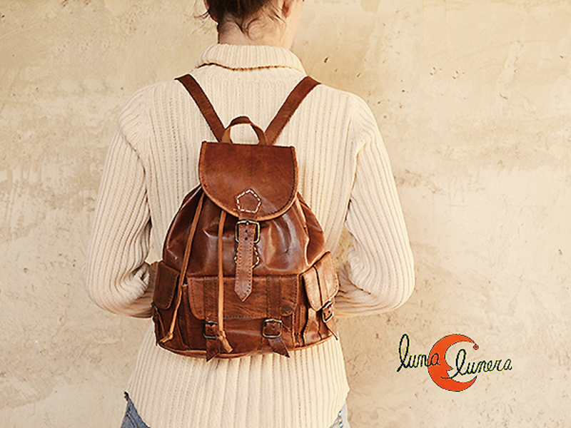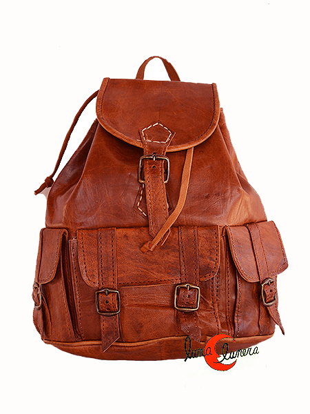 Mochila de cuero marroquí. Mochila pequeña tres bolsillos de piel engrasada.