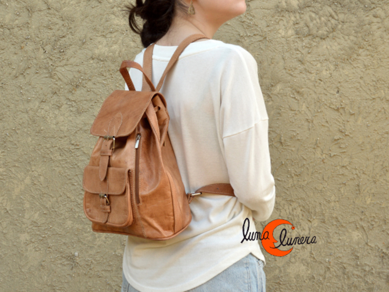 Mochila clásica de cuero marroquí pequeña. Tiene dos bolsillos exteriores delanteros que cierran con hevilla. Cierrra con solapa. Forrada por dentro. Asas regulables. Tiene un bolsillo pequeño interior que cierra con cremallera y otro antirrobo por la espalda.