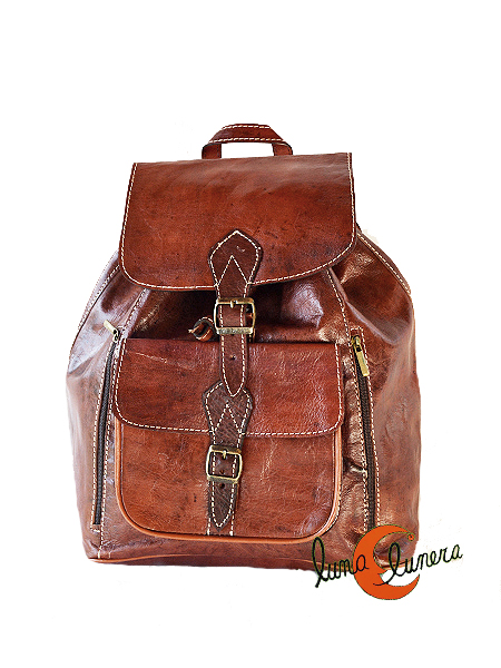 Mochila clásica de cuero marroquí envejecido con dos cremalleras y bosillo con hebilla en medio por el frente. Forrada por dentro. Asas ajustables y bolsillo de seguridad por la espalda.