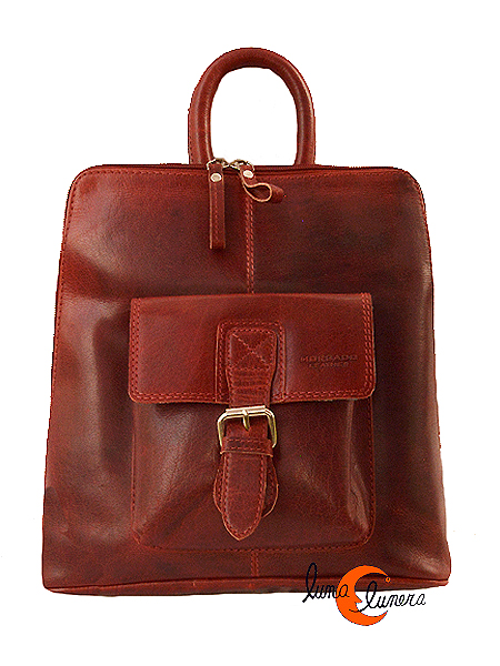 Mochila de piel cuadrada que cierra con cremallera. Tiene un bolsillo exterior grande por delante que cierra con broche de imán y otro antirrobo por la espalda con cremallera. Forrada con tela por dentro y en elinterior tiene otros dos bolsillos, uno con cremallera y el otro abierto para llevar el teléfono movil. Sus asas se pueden juntar con una cremallera, lo que le permite usarse tanto como mochila tradicional de dos asas (cuando están separadas), o si se unen, la mochila puede cruzarse en la espalda como si fuera un morral o bolso de bandolera. Este detalle la hace muy versátil y original. Piel fuerte, asas de cuero ajustables.