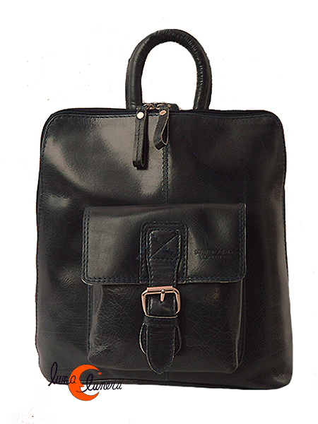 Mochila de piel cuadrada que cierra con cremallera. Tiene un bolsillo exterior grande por delante que cierra con broche de imán y otro antirrobo por la espalda con cremallera. Forrada con tela por dentro y en elinterior tiene otros dos bolsillos, uno con cremallera y el otro abierto para llevar el teléfono movil. Sus asas se pueden juntar con una cremallera, lo que le permite usarse tanto como mochila tradicional de dos asas (cuando están separadas), o si se unen, la mochila puede cruzarse en la espalda como si fuera un morral o bolso de bandolera. Este detalle la hace muy versátil y original.  Piel fuerte, asas de cuero ajustables.