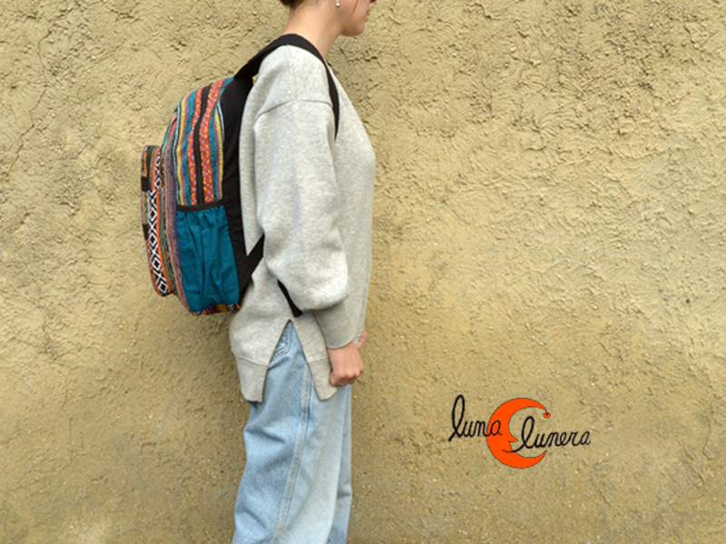 Mochila grande de gran capacidad. Caben carpetas y un ordenador portátil. 100% algodón, hecha en Nepal. Súper liviana y muy cómoda. De asas ajustables. Tiene un bolsillo delantero muy amplio con tres bvolsillos independientes, todos con cremallera, además de dos espacios para llevar botellas en los laterales sujetas con goma. Forrada por dentro, tiene una tela separa el interior en dos compartimentos.