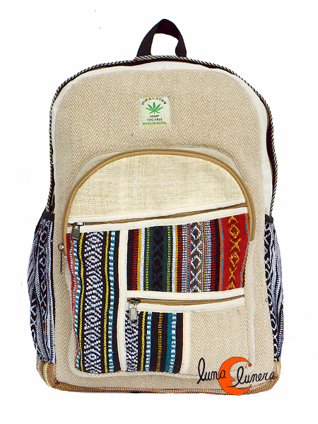 Mochila grande de gran capacidad. Caben carpetas y un ordenador portátil. 100% algodón y fibra de cáñamo, hecha en Nepal. Súper liviana y muy cómoda. De asas ajustables. Tiene un bolsillo delantero muy amplio con dos bolsillos independientes, todos con cremallera, además de dos espacios para llevar botellas en los laterales sujetas con goma. Forrada por dentro, tiene una tela que separa el interior en dos compartimentos.