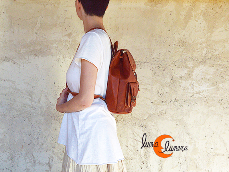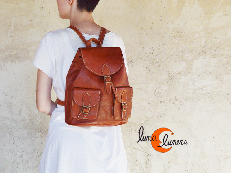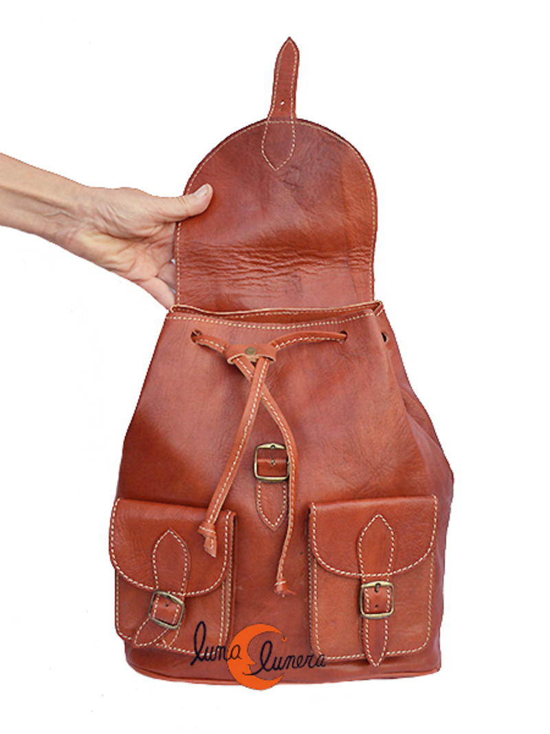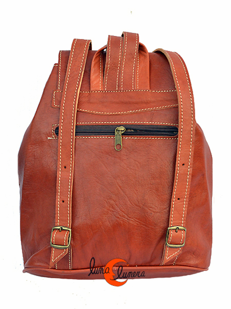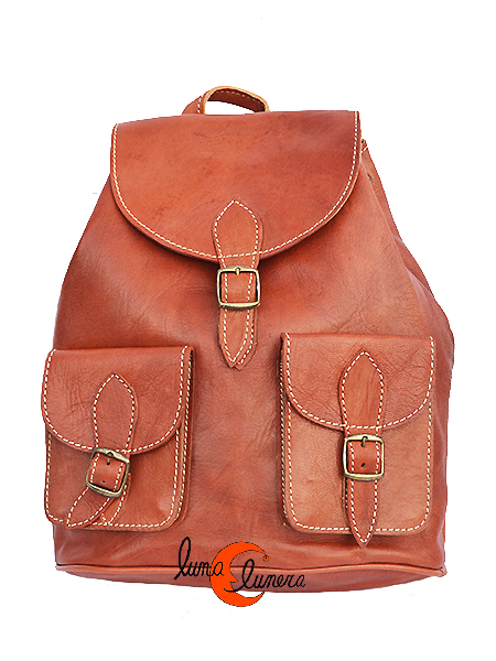 Mochila de cuero marroquí. Mochila mediana dos bolsillos, marrón teja.
