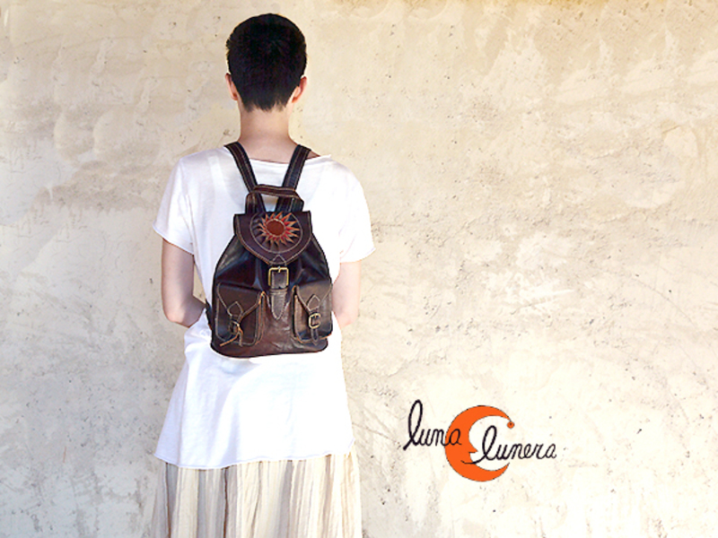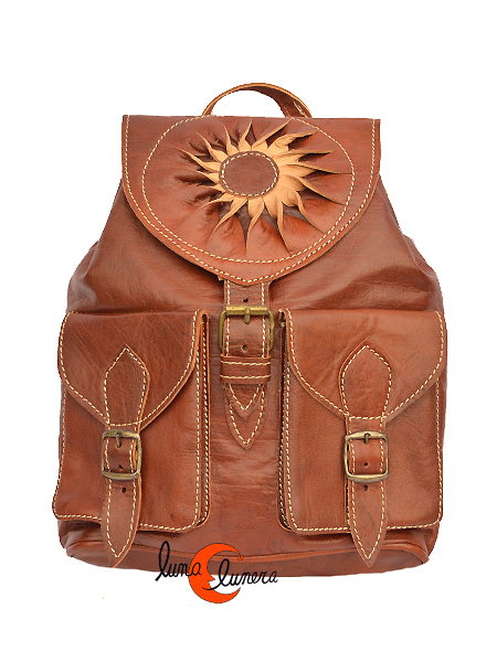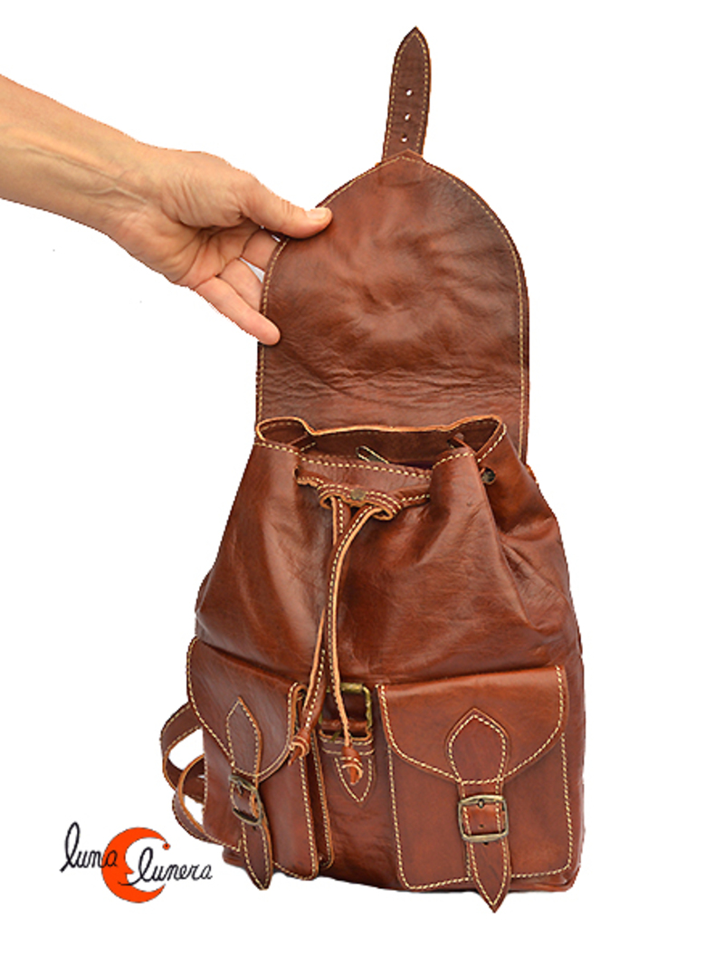 Mochila de cuero marroquí. Mochila pequeña dos bolsillos, marrón claro.