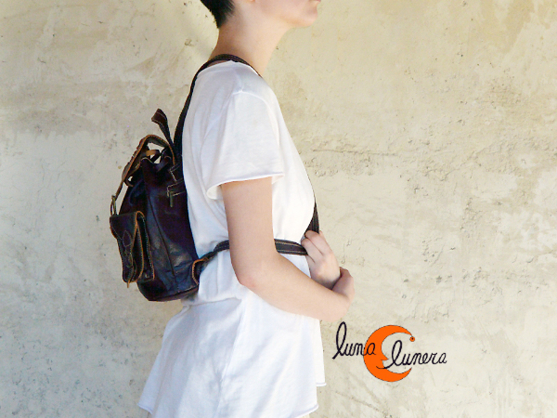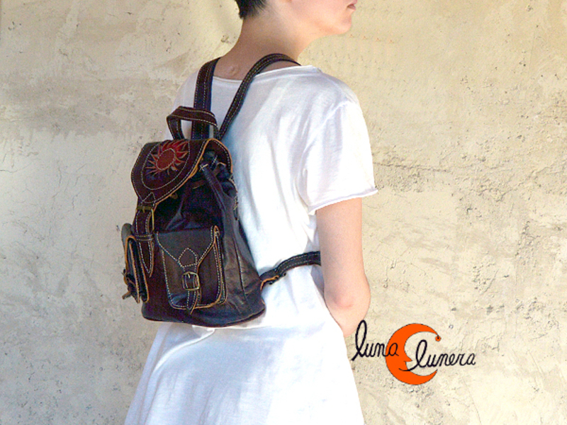 Mochila de artesanía marroquí pequeña con dos bolsillos laterales con hebillas por delante. Cierra con lazo bajo la solapa que se cierra también con hebilla. Tiene bolsillo con cremallera antirrobo por la espalda. Forrada por dentro, tiene un bolsillo pequeño interior con cremallera. Asas regulables.