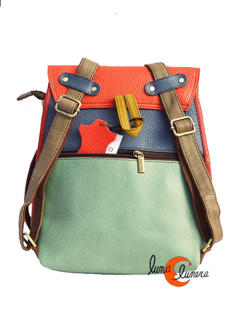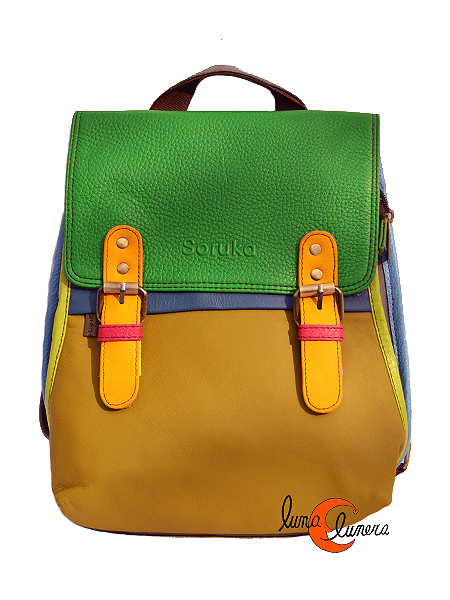 Mohila pequeña con solapa convertible en bolso de bandolera de la casa catalana Soruka fabricado en India con pieles recicladas. Producto de artesanía hecho con buenos acabados y buenos materiales, garantía de calidad. Cierra con cremallera que se protege bajo una solapa con dos cierres de imán, las hebillas son decorativas. Por dentro es de un sólo compartimento grande forrado con tela. Tiene además, un pequeño bolsillo con cremallera interior. Por la espalda tiene un bolsillo grande antirrobo con cremallera y por delante tiene otro bolsillo también con cremallera. Gracias a sus asas, se puede usar tanto como una mochila o como un bolsos bandolera. Es muy cómodo y muy bonito, no muy grande, pero con capacidad.