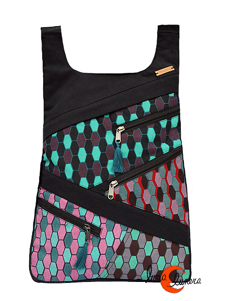 Mochilas de loneta Mugling. Mochila con cinco cremalleras por el frente (cada una es un bolsillo) y otros dos bolsillos por detrás, uno con cremallera redondeada que es el compartimento principal de la mochila y otro pequeño más abajo con cremallera resta. La parte alta es tipo "camiseta" para que no duelan los hombros. Mezcla tela de algodón lisa negra con telas rústicas y estampadas de colores. Asas regulables. Forrada por dentro y con un bolsillo interior también con cremallera. tamaño: altura 36 cm. ancho 28 cm. base 9 cm.