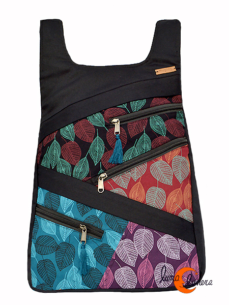 Mochilas de loneta Mugling. Mochila con cinco cremalleras por el frente (cada una es un bolsillo) y otros dos bolsillos por detrás, uno con cremallera redondeada que es el compartimento principal de la mochila y otro pequeño más abajo con cremallera recta. La parte alta es tipo "camiseta" para que no duelan los hombros. Mezcla tela de algodón lisa negra con telas rústicas y estampadas de colores. Asas regulables. Forrada por dentro y con un bolsillo interior también con cremallera. tamaño: altura 36 cm. ancho 28 cm. base 9 cm.