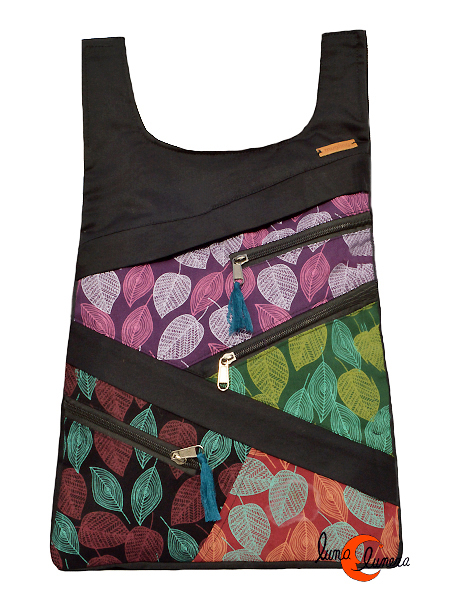 Mochilas de loneta Mugling. Mochila con cinco cremalleras por el frente (cada una es un bolsillo) y otros dos bolsillos por detrás, uno con cremallera redondeada que es el compartimento principal de la mochila y otro pequeño más abajo con cremallera recta. La parte alta es tipo "camiseta" para que no duelan los hombros. Mezcla tela de algodón lisa negra con telas rústicas y estampadas de colores. Asas regulables. Forrada por dentro y con un bolsillo interior también con cremallera. tamaño: altura 36 cm. ancho 28 cm. base 9 cm.