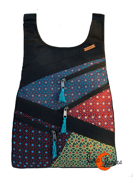 Mochilas de loneta Mugling. Mochila con cinco cremalleras por el frente (cada una es un bolsillo) y otros dos bolsillos por detrás, uno con cremallera redondeada que es el compartimento principal de la mochila y otro pequeño más abajo con cremallera recta. La parte alta es tipo "camiseta" para que no duelan los hombros. Mezcla tela de algodón lisa negra con telas rústicas y estampadas de colores. Asas regulables. Forrada por dentro y con un bolsillo interior también con cremallera. tamaño: altura 36 cm. ancho 28 cm. base 9 cm.