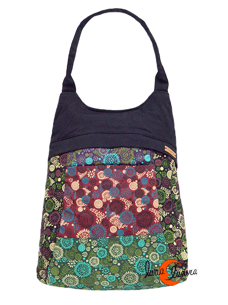 Mochilas de tela Mugling. Mochila bolso negra florecillas verde y granate.