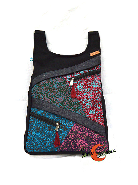 Mochilas de loneta Mugling. Mochila con cuatro cremalleras por el frente (cada una es un bolsillo) y otra por detrás de seguridad (pegada a la espalda) La parte alta es tipo "camiseta" para que no duelan los hombros. Mezcla tela de algodón lisa negra con telas rústicas y estampadas de colores. Asas regulables. Forrada por dentro y con un bolsillo interior también con cremallera. tamaño: altura 36 cm. ancho 28 cm. base 9 cm.