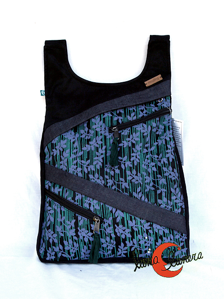 Mochilas de loneta Mugling. Mochila con cuatro cremalleras por el frente (cada una es un bolsillo) y otra por detrás de seguridad (pegada a la espalda) La parte alta es tipo "camiseta" para que no duelan los hombros. Mezcla tela de algodón lisa negra con telas rústicas y estampadas de colores. Asas regulables. Forrada por dentro y con un bolsillo interior también con cremallera. tamaño: altura 36 cm. ancho 28 cm. base 9 cm.