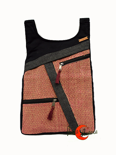 Mochilas de loneta Mugling. Mochila con cuatro cremalleras por el frente (cada una es un bolsillo) y otra por detrás de seguridad (pegada a la espalda) La parte alta es tipo "camiseta" para que no duelan los hombros. Mezcla tela de algodón lisa negra con telas rústicas y estampadas de colores. Asas regulables. Forrada por dentro y con un bolsillo interior también con cremallera. tamaño: altura 36 cm. ancho 28 cm. base 9 cm.