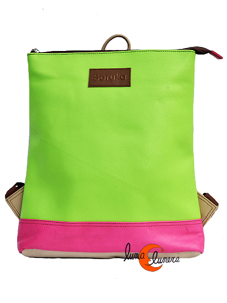 Mochila cuadrada de piel de colores de la casa catalana Soruka, fabricada en India con pieles recicladas. Producto de artesanía hecho con buenos acabados y buenos materiales, garantía de calidad. De un sólo espacio amplio en el interior, cierra con cremallera superior. Por dentro está forrada con tela y tiene un pequeño bolsillo con cremallera. Por detrás y por el costado tiene otro bolsillo antirrobo con cremallera vertical. Es una mochila muy original, espaciosa, moderna y muy bonita, de tamaño medio pero con bastante capacidad. Es de piel blanda y suave.