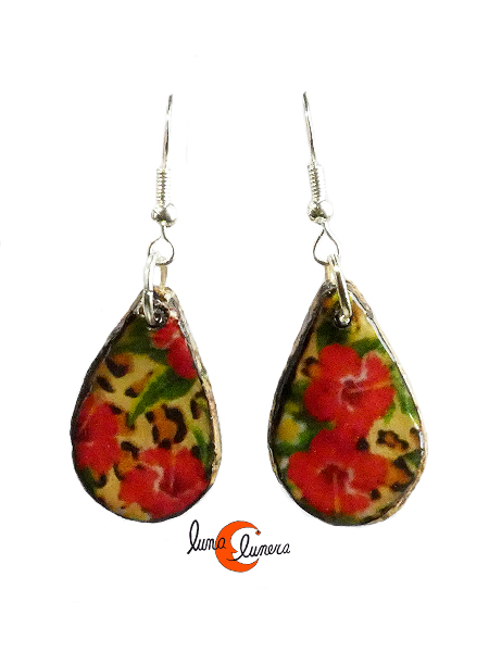Mondo Manzana, bisuteria con magaya de sidra. Pendientes medianos gota pequeña flor de hibisco roja.