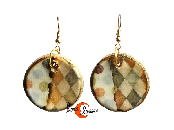 Mondo Manzana, bisutería con magaya de sidra. Pendientes medianos redondel grande arlequín con purpurina dorada.