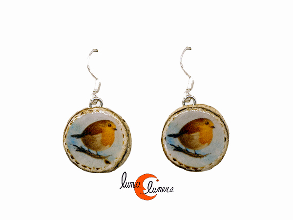 Mondo Manzana, bisutería con magaya de sidra. Pendientes pequeños círculos, raitán o pájaro petirrojo.