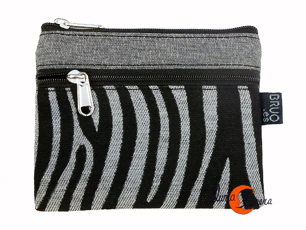 Monederos de tela Bruo. Monedero grande de dos cremalleras. Cebra gris y negro.