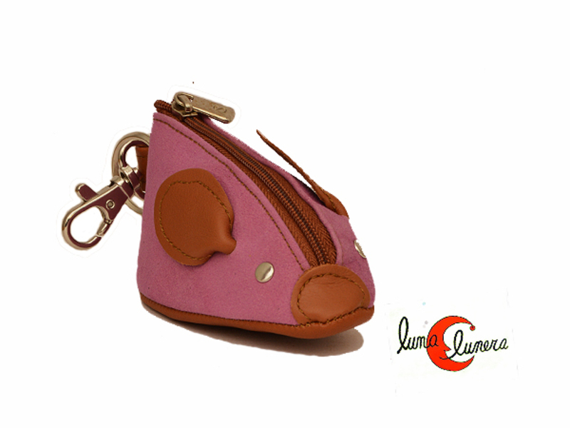 Original monedero con forma de ratón de la casa Morgado. Cierra con cremallera y tiene un mosquetón para  usarlo tanto como llavero,como para colgarlo en el bolso para tenerlo siempre a mano. Está hecho de ante y piel. Tiene una base amplia de 11 por 5 cm. lo que permite que al abrirlo, se vean muy bien las monedas y se cojan con facilidad.