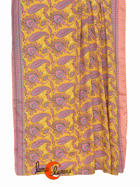 Pañuelo fular o pareo de seda de india. Cachemir grande fondo amarillo y franja gris.