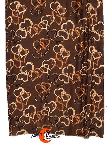 Pañuelos tipo fular muy suave, 50% algodón y 50% viscosa. Tiene dibujos de corazones sobre un color, los corazones están hechos con líneas simples reforzadas con algun reborde en dorado, lo que le da un toque muy original y elegante. Colores neutros, muy fáciles de combinar.