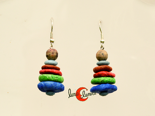 Pendientes hechos de papel maché, de la colección propia Luna Lunera. Producto de artesanía, pintados con vivos colores. No pesan nada y son absolutamente originales. Se les pueden poner ganchos de plata.