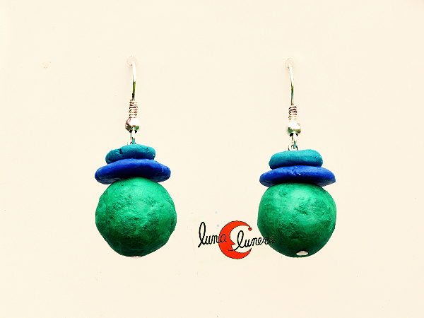 Pendientes hechos de papel maché, de la colección propia Luna Lunera. Producto de artesanía, pintados con vivos colores. No pesan nada y son absolutamente originales. Se les pueden poner ganchos de plata.