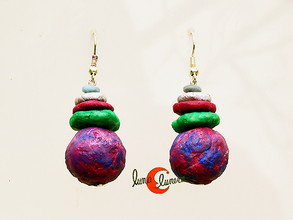 Pendientes hechos de papel maché, de la colección propia Luna Lunera. Producto de artesanía, pintados con vivos colores. No pesan nada y son absolutamente originales. Se les pueden poner ganchos de plata.
