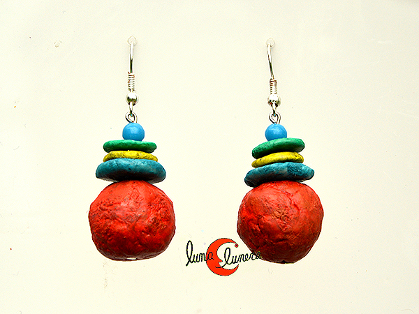 Pendientes hechos de papel maché, de la colección propia Luna Lunera. Producto de artesanía, pintados con vivos colores. No pesan nada y son absolutamente originales. Se les pueden poner ganchos de plata.