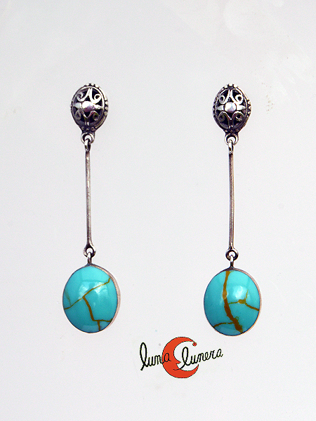 Pendientes de plata y piedra. Pendientes largos con turquesa y filigrana. Cierre con tuerca a presión.