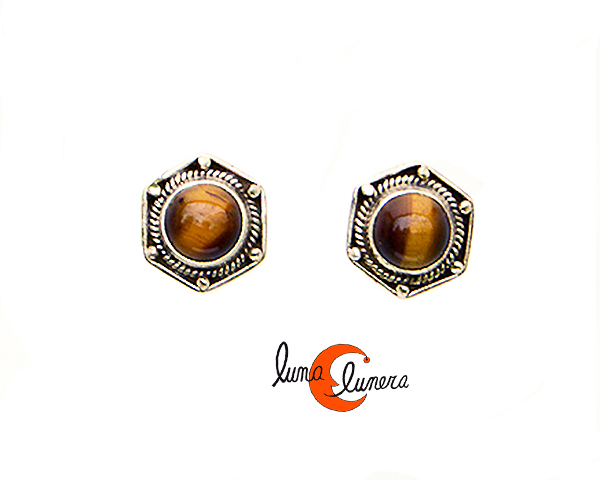 Pendientes de plata y piedra. Pendientes grandes pegados al lóbulo con forma hexagonal, ojo de tigre.