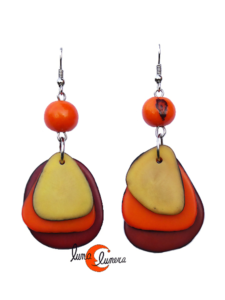Pendiente hecho con semillas de tagua. Son pendientes artesanales, muy vistosos, originales y divertidos, las semillas mantienen siempre el color y el brillo. No pesan, son muy livianos.